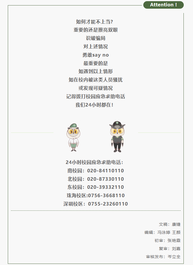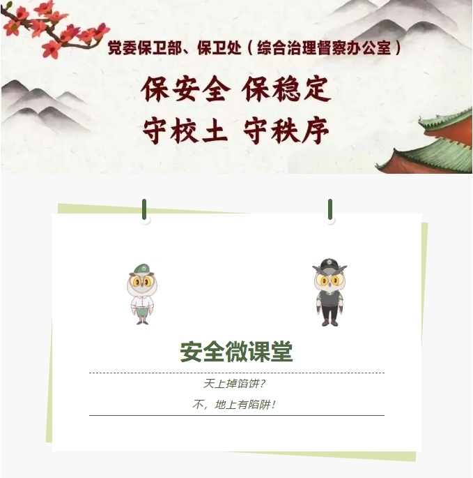 导航痕迹 中山大学党委保卫部 安全教育 治安(含反诈) 天上掉馅饼?不,地上有陷阱 扫描此二维码分享 业务办理 校外人员和车辆入校申请 车辆通行证办理 中层干部因私出国(境)申请 户籍服务 联系电话 天上掉馅饼?不,地上有陷阱 发布人:吴慧 发布日期:2023-10-30